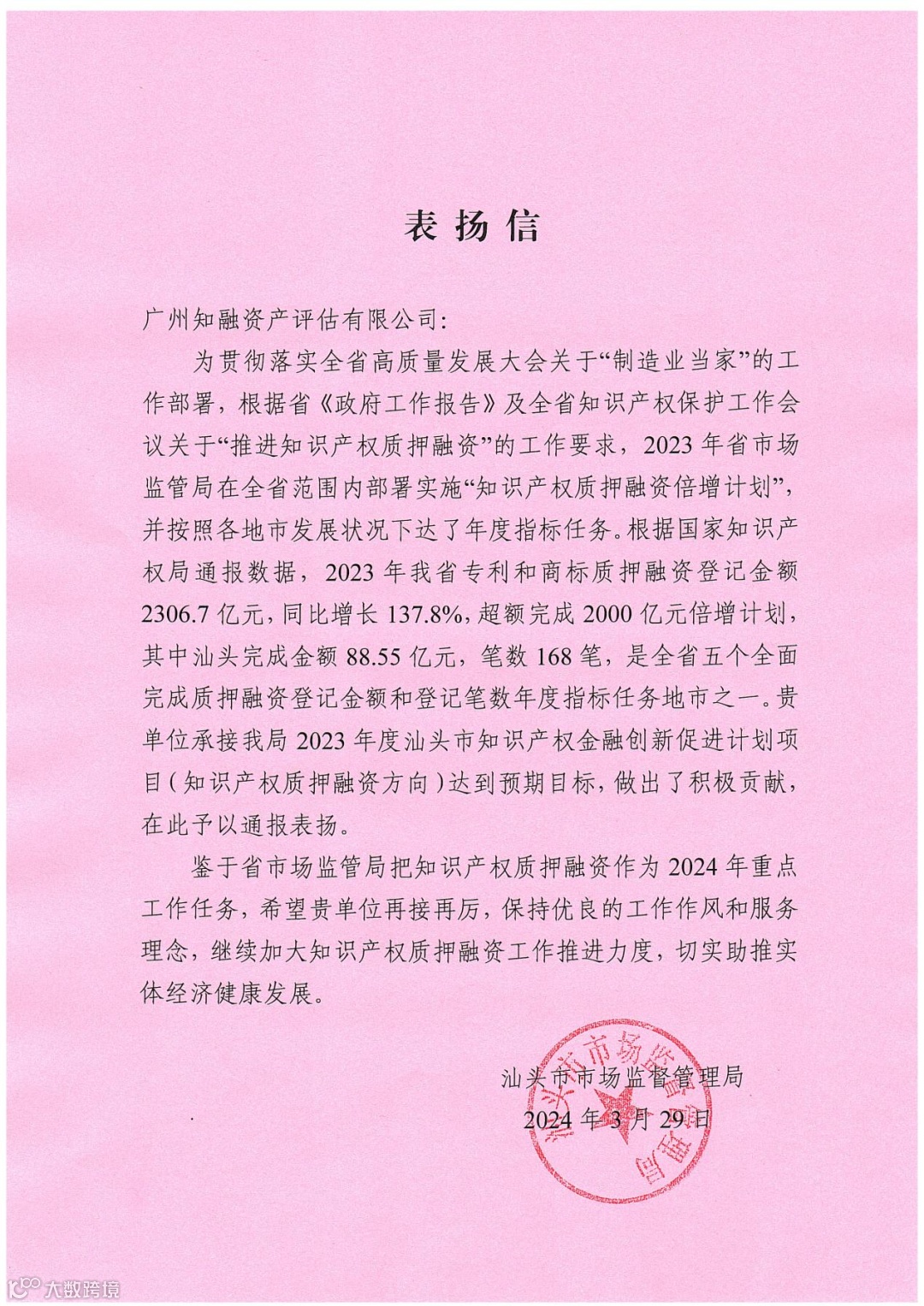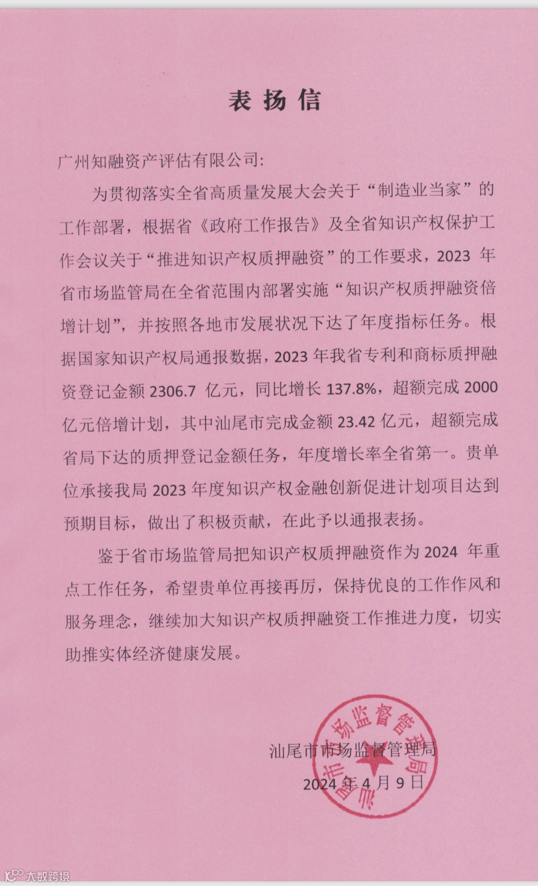 近年来,知融评估陆续成为广州市、佛山市、梅州市、清远市、揭阳市、汕头市、汕尾市等多地市知识产权金融创新促进计划项目的承担单位,为地级市知识产权质押融资工作的推进做出了积极贡献,并因此获得了政府部门的表彰。