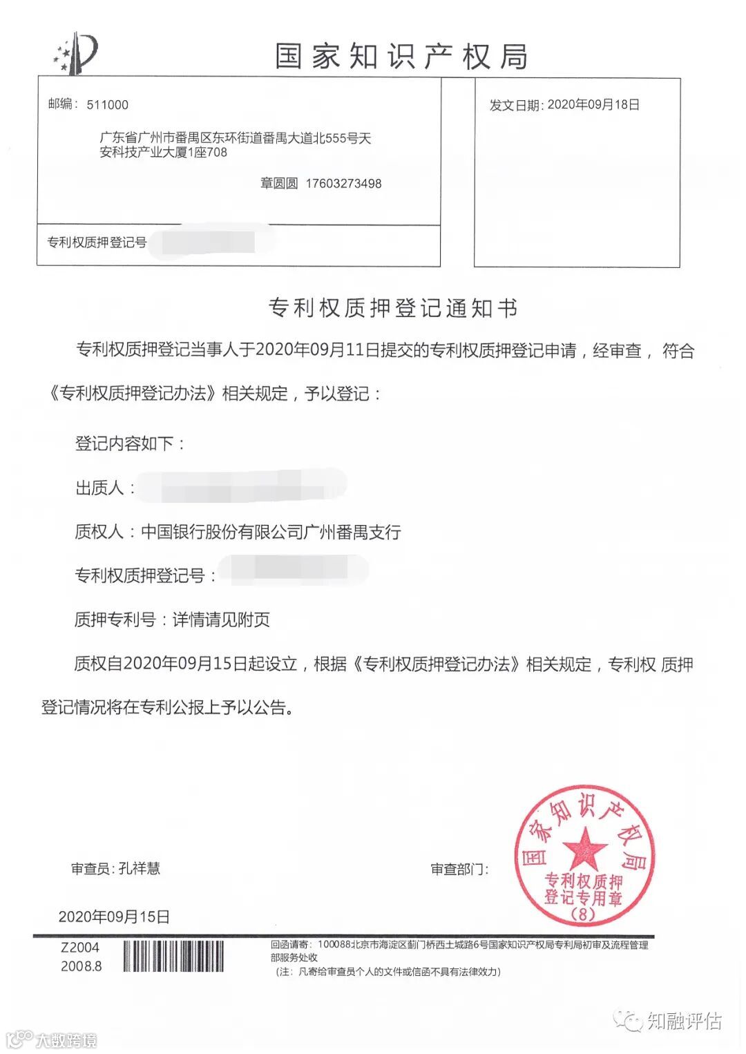 广州xxx科技有限公司以自有的实用新型专利,通过知融评估公司的评估。同时,知融评估公司免费协助该企业办理专利质押登记,质押金额为1000万元。最后,广州xxx有限公司成功获得中国银行广州番禺支行的知识产权质押融资信贷支持。