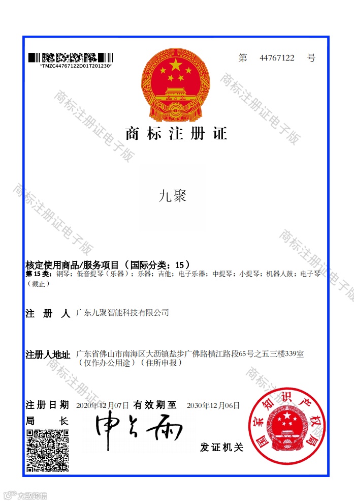 九聚智能我司品牌战略取得新进展,由我司申请的第15类“九聚”、第40类“九聚”两项商标喜获国家工商行政管理总局商标局批复,并颁发了 “商标注册证书”。