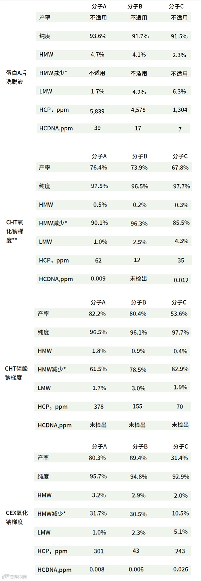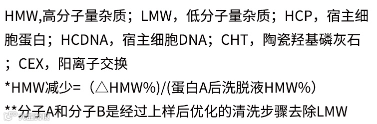 4 HCP和其他杂质:CHT氯化钠梯度洗脱HCP清除率最高,增加磷酸盐浓度可以大量去除LMW。
