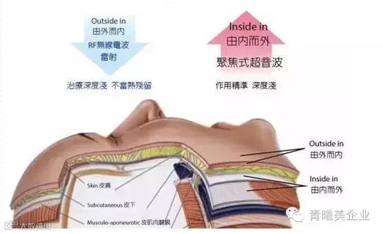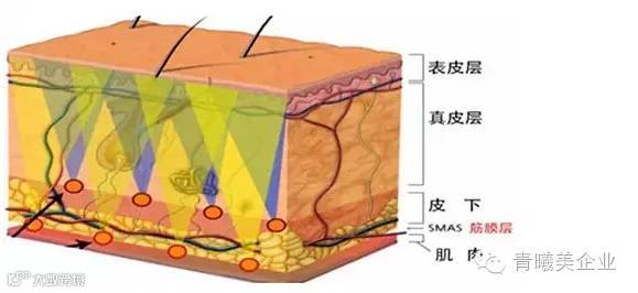 利用超声波技术穿透皮层直达3~4.5毫米,深至浅肌肉筋膜组织SMAS上(人体筋膜层),使组织所产生的热能聚焦在一点,让皮肤得到拉紧并提升,达到筋膜悬吊拉皮的效果。再精确地改善支撑皮肤的皮下结构,令老化的骨胶原蛋白收缩并刺激胶原增生和重组,构建全新的胶原蛋白纤维网,从皮肤底层恢复弹力。也正因为其深度热度和精准度都超高的原因,被称作抗衰界的超级战舰!