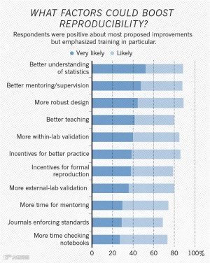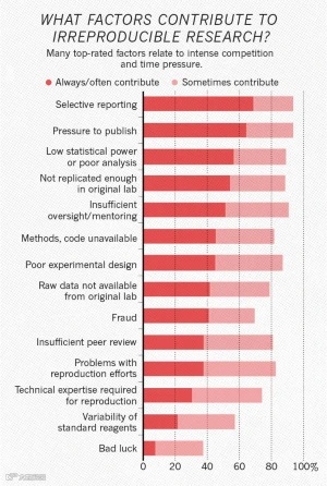 超过60%的受访者表示,发表论文的压力和有目的的选择性报告结果是导致可重复性问题的原因。半数以上的受访者认为是实验室重复不足、监督不力或统计能力不足造成的。还有一小部分人指出了试剂的变异或使用难以重复的专门技术等阻碍了结果的重现性。