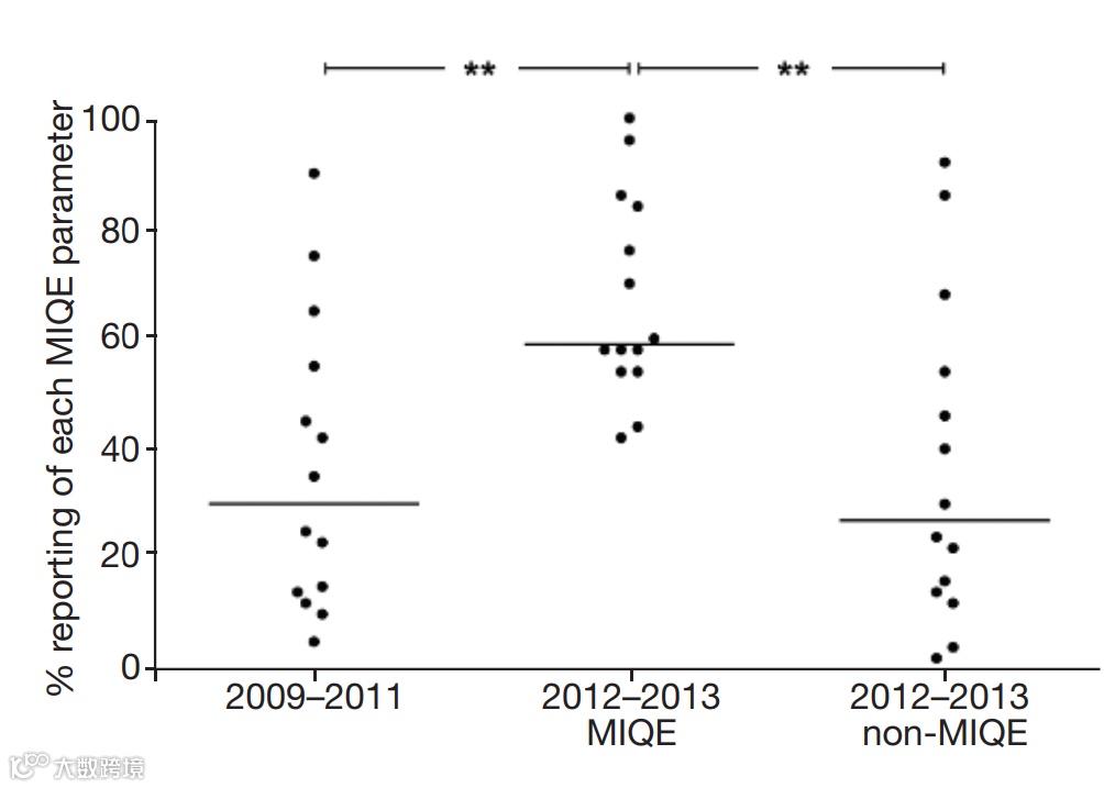 对使用 RT-PCR (qPCR) 的 1,700 多种出版物进行的两项调查显示:MIQE 指南对2012-2013年使用 qPCR 发表的论文的数据报告质量产生了重大影响。与2009-2011年所有分析过的 qPCR 论文相比,引用 MIQE 指南的论文在报告14个重要参数方面有了持续、显著的提高,尤其是在 RNA 质量、PCR 效率和数据归一化处理方面。很显然引用 MIQE 指南的论文显着提高了实验数据的透明度。