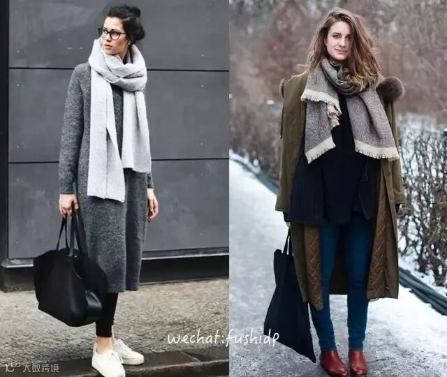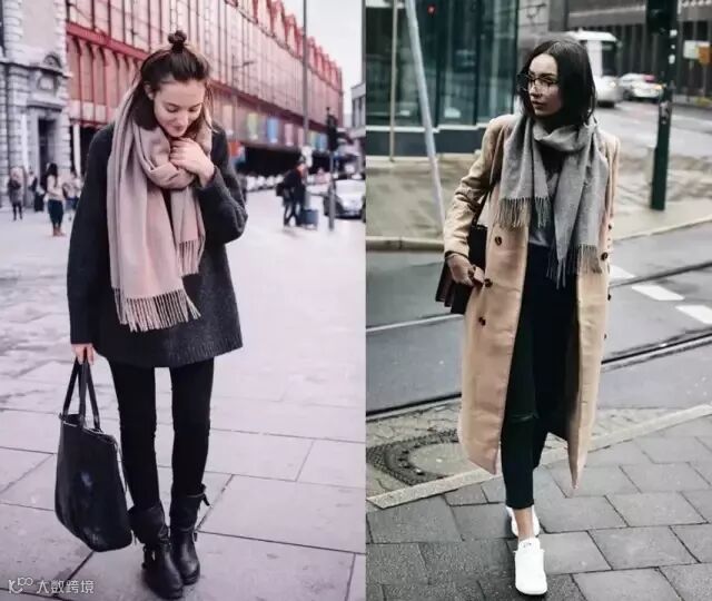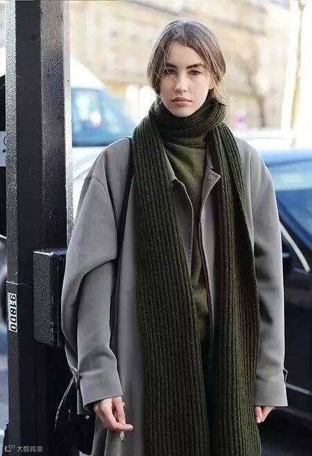 一般来说,围巾首选比较宽大的款式,保暖效果好也能够完成更多种时髦系法。