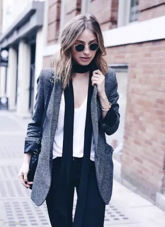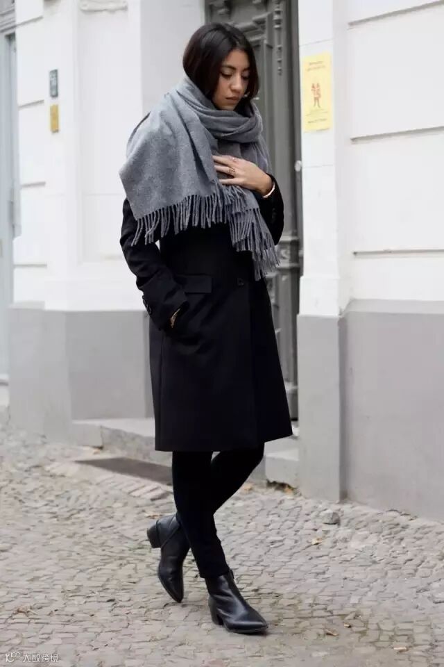 这种看似漫不经心的系法能够给人一种时髦得不费力气的感觉,所以一定要选择基础色大围巾才不会显得太刻意。