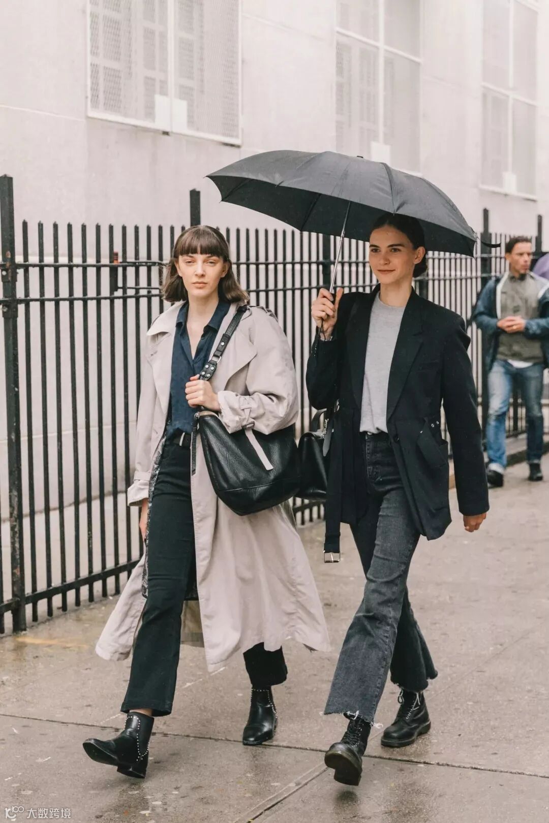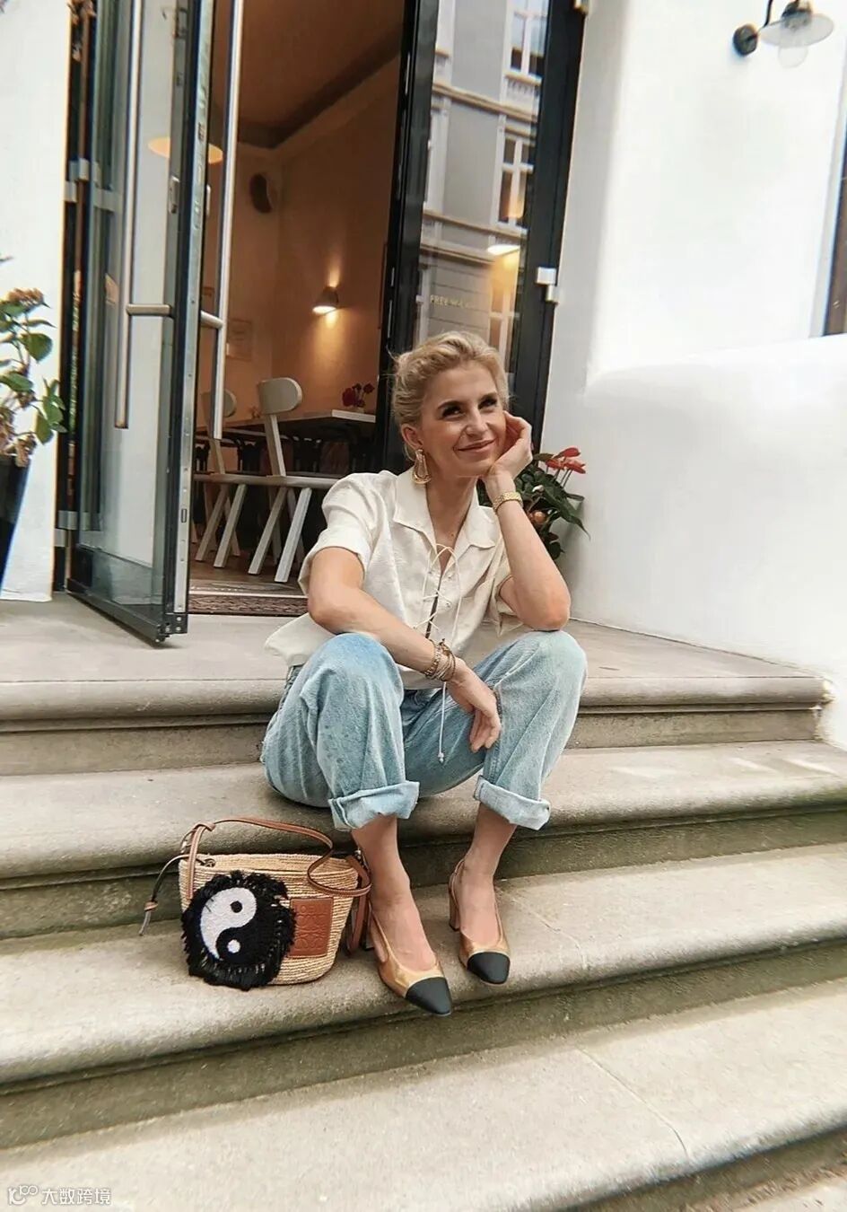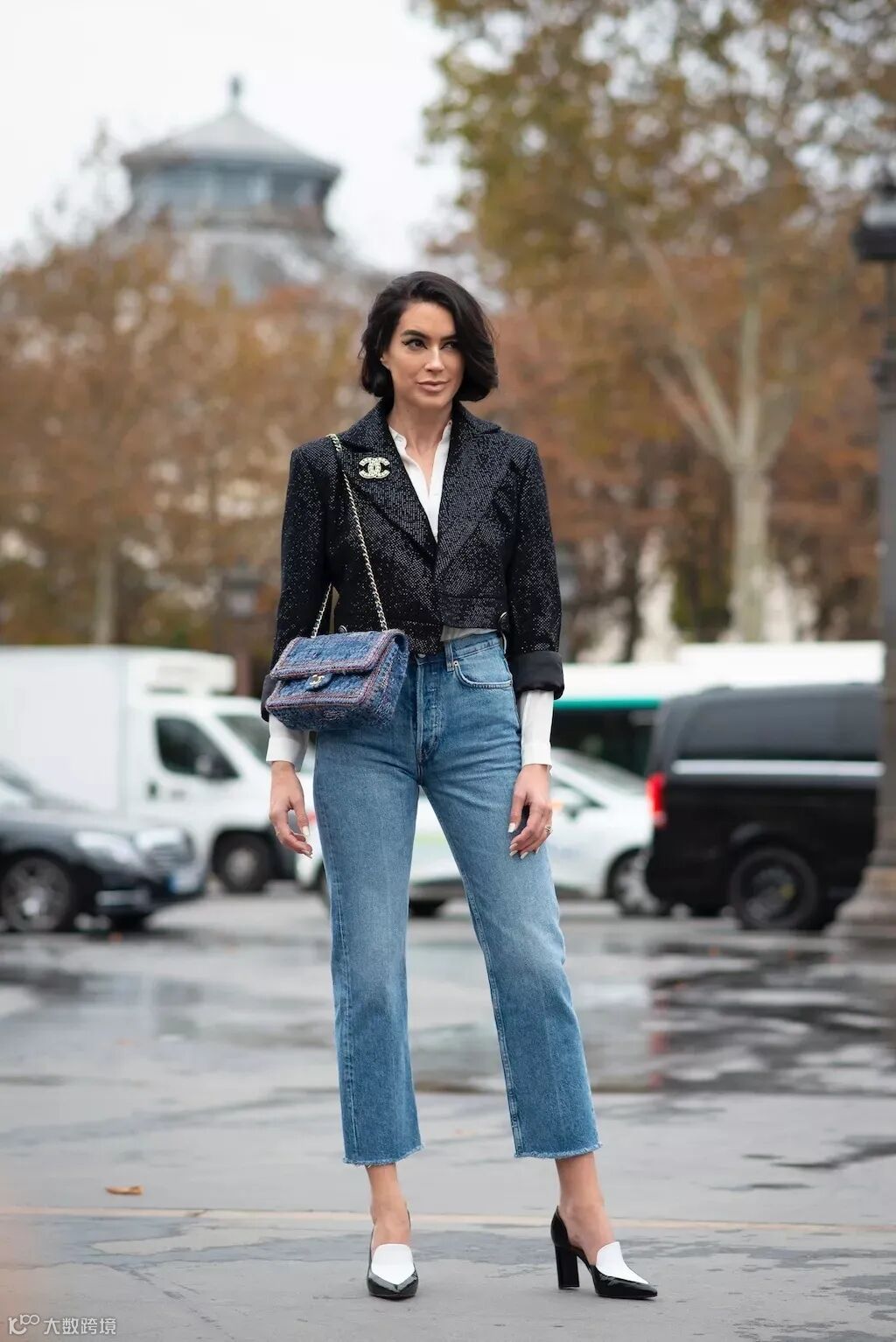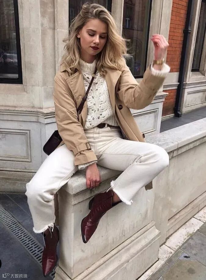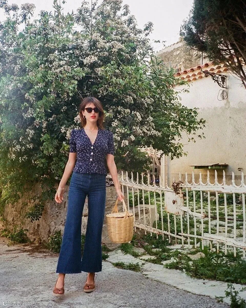 法国博主Jeanne Damas胯比肩窄,只要穿上微喇叭裤,她的身材从视觉上看起来就很平衡。
