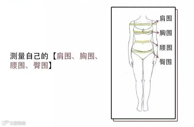 首先,我们需要清楚的知道自己是什么身材,这样才能更好的“对症下药”。所以大家先自行测量自己的肩围、胸围、腰围、臀围▼