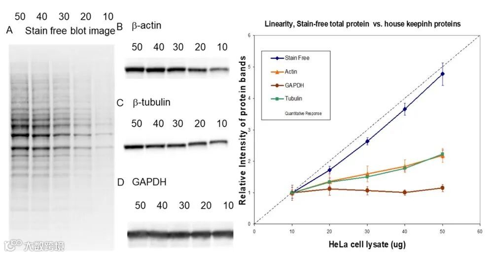 Stain-Free被证明是一个比常用管家蛋白(actin、tubulin、GAPDH)更为稳定、精准的内参定量参考,并且具有更为理想的线性动态范围,是传统管家蛋白内参的替代(文献2)。