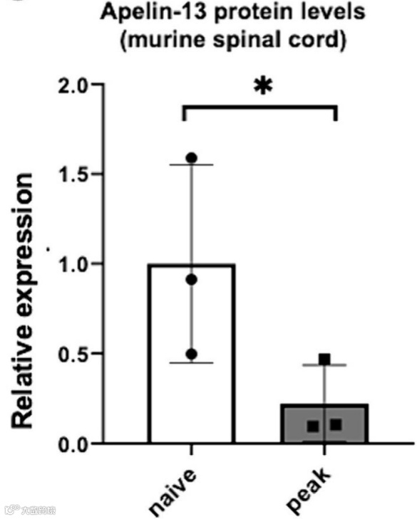 研究发现EAE 小鼠和 MS 患者的中枢神经系统中 Apelin 蛋白质水平均降低。而通过氟化阿普林肽补充 Apelin 13 能够穿过 BBB 并改善 EAE 评分。氟化阿普林肽可在体外保存神经元并介导小胶质细胞和巨噬细胞的功能。