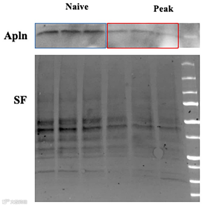 Stain-Free免染总蛋白归一化后获得的Apelin-13定量结果显示。多发性硬化症高峰阶段Apelin-13的表达量显著下调。