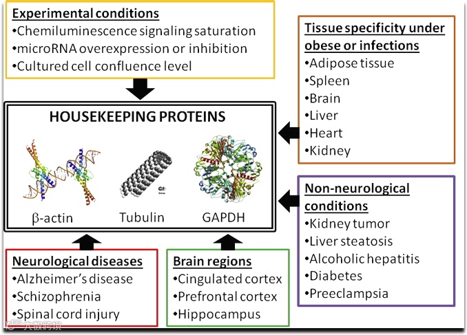 另外,不可忽视的是多种病理、非病理情况都会影响传统内参蛋白(actin、tubulin、GAPDH)表达量的恒定(参考文献1)。例如在脊髓损伤和阿尔茨海默氏病等各种神经病理事件中,一些看家基因在 mRNA 和蛋白质水平上存在显着变化。各种组织中的非神经元疾病,如肾肿瘤、糖尿病、肝脂肪变性等也会引起管家基因的变化。这些发现引起了人们对使用管家蛋白作为内参是否合适的潜在担忧。
