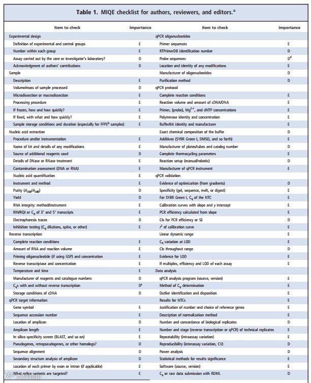MIQE 是国际上最新推出的一套指南,就评价RT-PCR(qPCR)实验和发表文章时所必需的实验信息提出了最低限度的标准(即那些必需的实验信息),不仅面向作者,同时审核人和编辑也应该参考该指南。MIQE 指南是文章投稿时需要同时提交的一个实验清单(🔗文末扫码以获得 MIQE 指南原文及Checklist)。通过论文作者提供相关的实验相条件和实验特点,审稿人可以评价实验所用方法的可靠性,另外提供详细的实验所用试剂、序列和分析方法,以保证其他研究人员可以利用这些信息进重现实验结果,qPCR 实验必须报告这些信息,以确保其相关性、准确性、正确解释和可重复性。MIQE 的细节应当作为在线发表的一个附件或者简要形式同时发表。