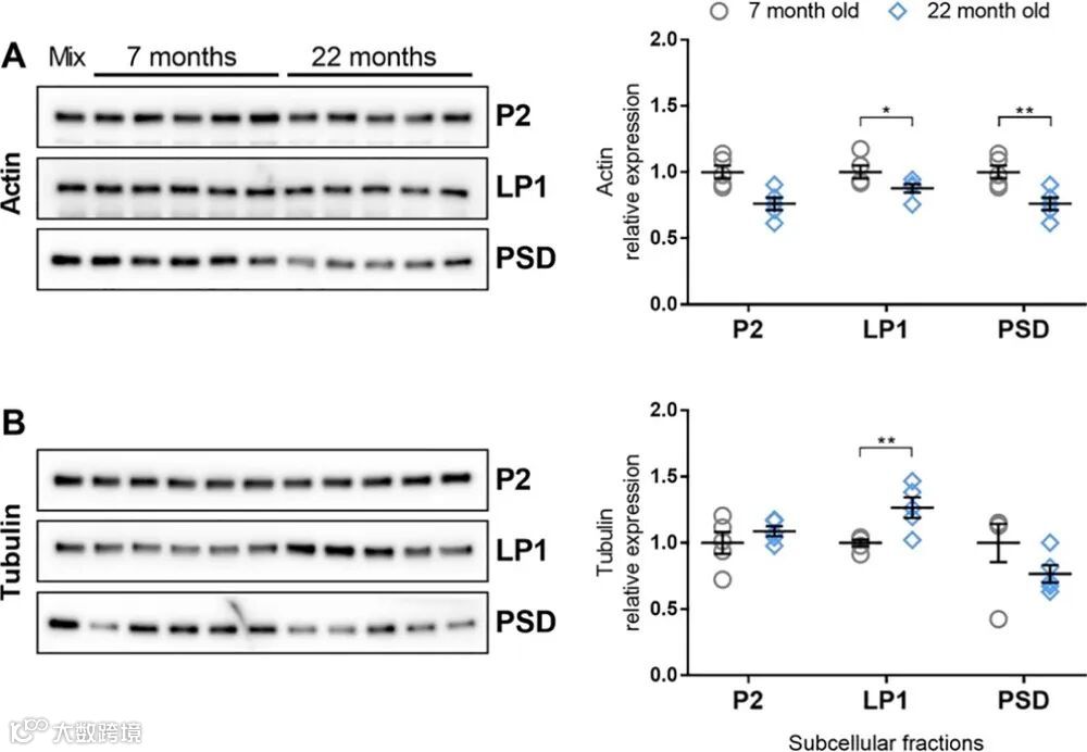 这样的结果并不出人意外,作为细胞骨架的 β-tubulin 与 β-actin 是树突组织的主要成分,对于维持树突棘形态、组织 PSD 及锚定/稳定突触后体至关重要。而正常衰老会差异性的改变构成神经元结构元素的动态分子实体,如 β-tubulin 与 β-actin 的表达。