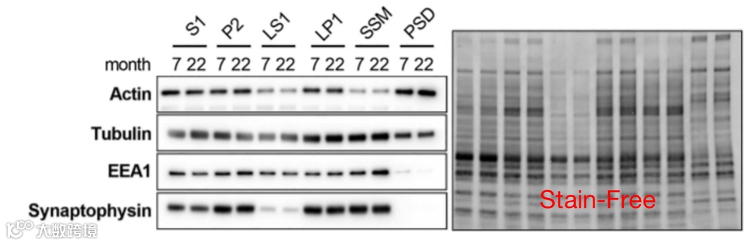 而与 β-tubulin 及 β-actin 不同的是,Stain-Free 所获得的总蛋白在小鼠衰老过程中的不同亚组织部位表达量相对恒定,作为内参,可以获得更精准的 Western 定量结果。