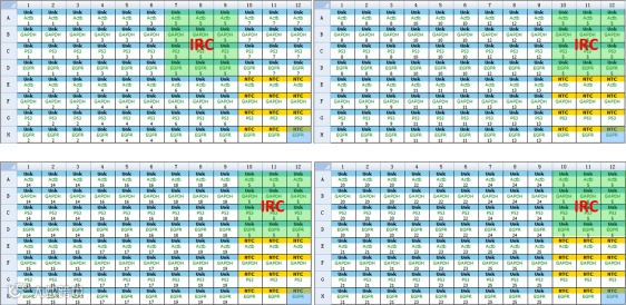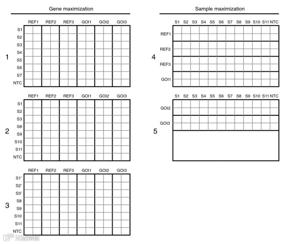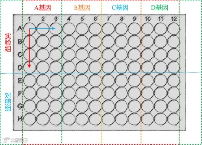 以图示96孔板为例,分实验组和对照组两组,检测 A,B,C,D 共4个基因,有两种布板方式可参考,其余情况依此类推。