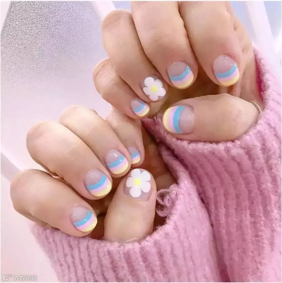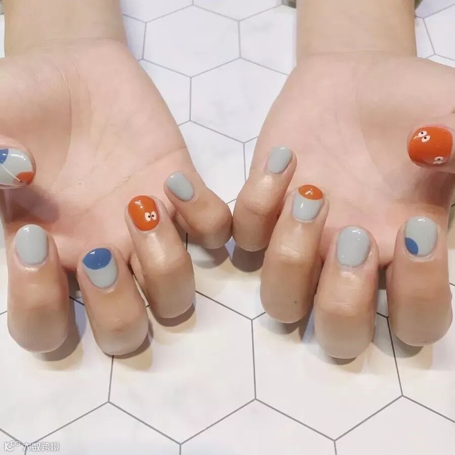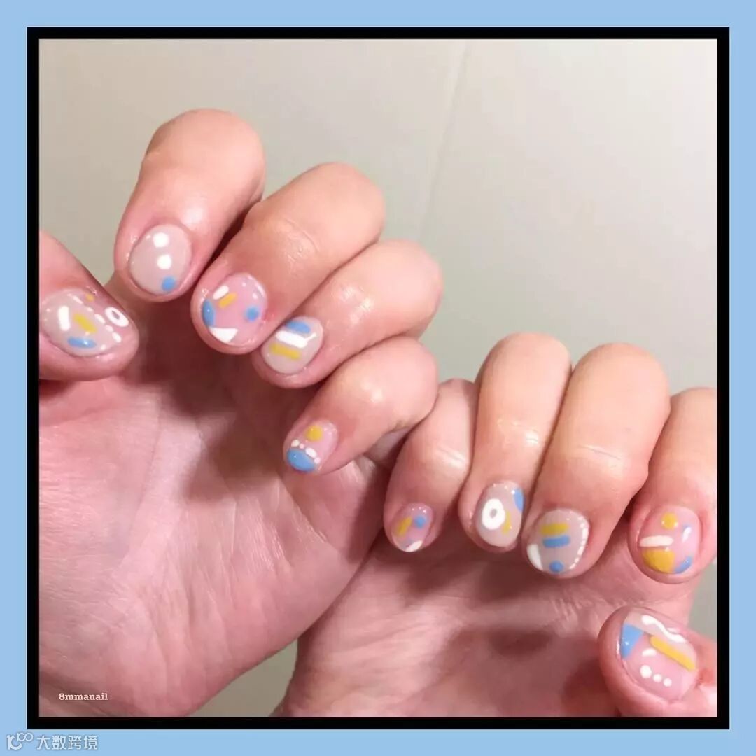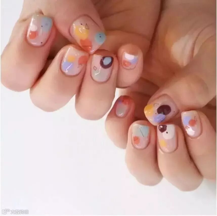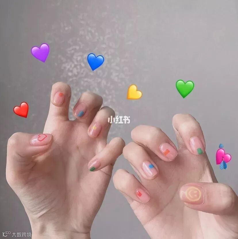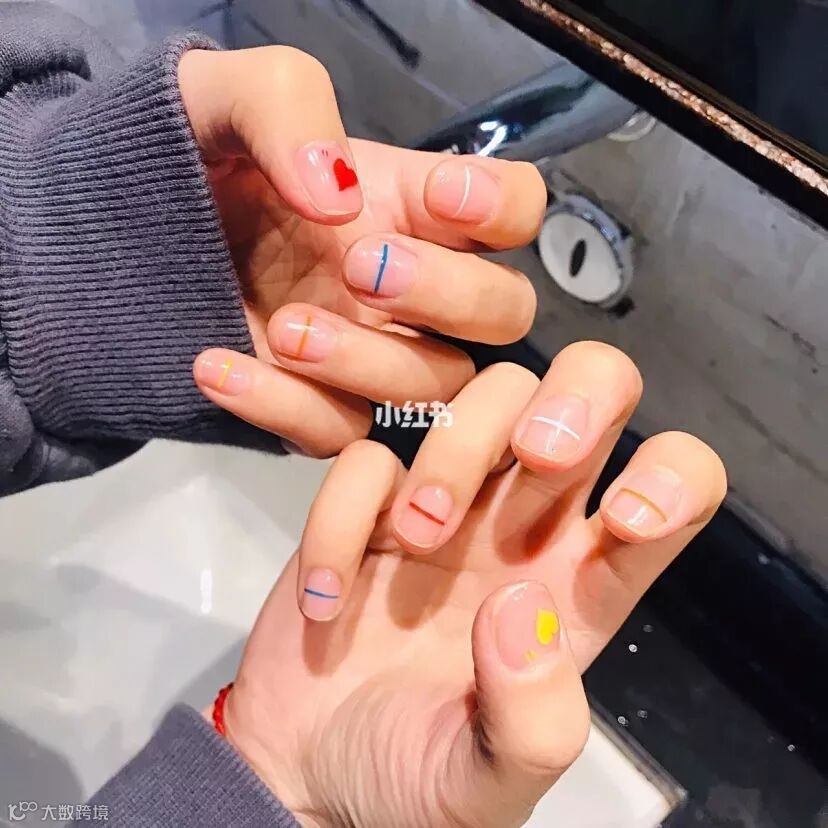 一说泫雅风,不要只想到小花朵,其实搜一下「泫雅美甲」你会发现,还有线条小元素为主的简约风格美甲,和颜色运用极其多的跳色风格。那么什么是跳色呢,百度上是这样解释的:容易给人带来视觉冲击的颜色,比如明黄、大红这些经常见于设计师与装修公司作品中的颜色。