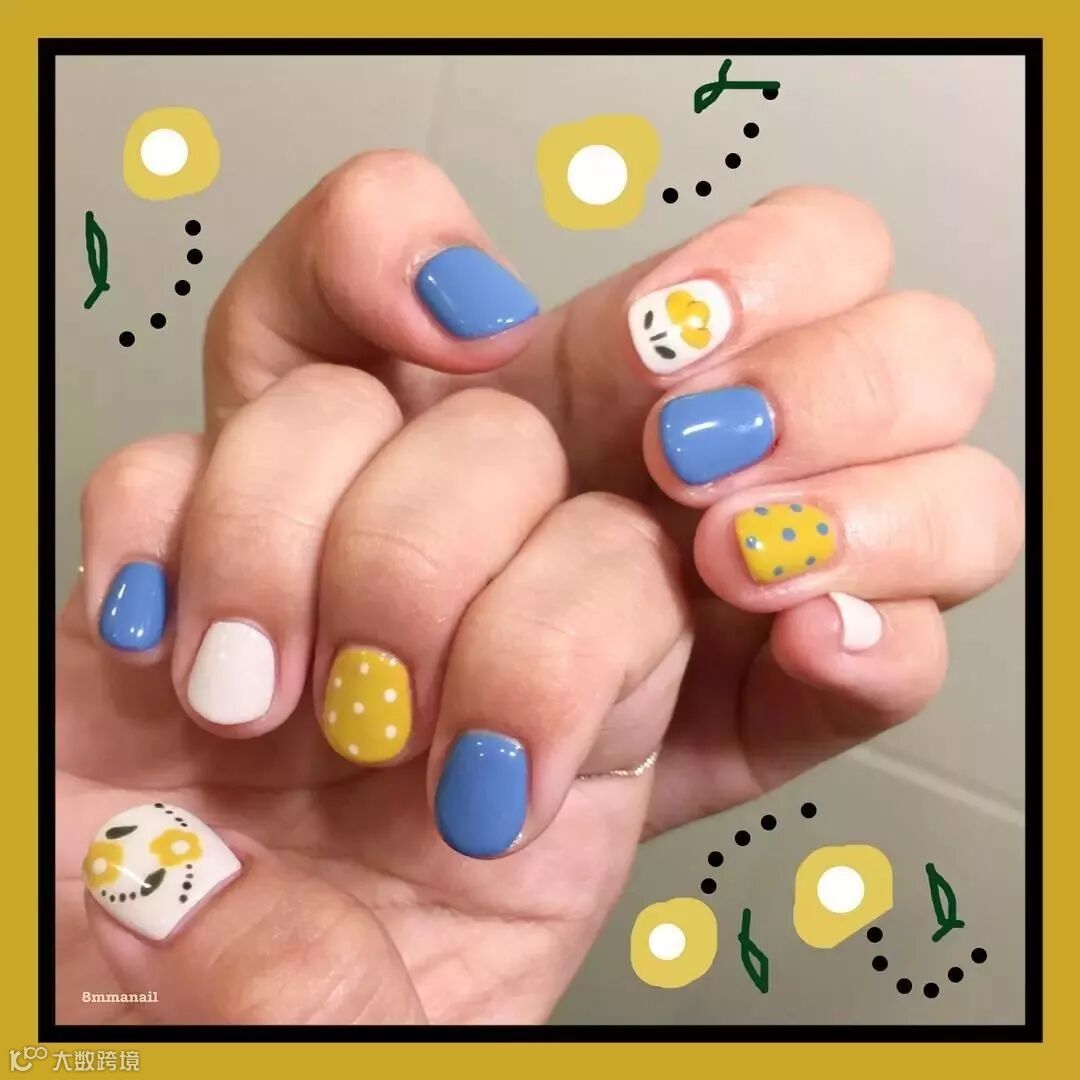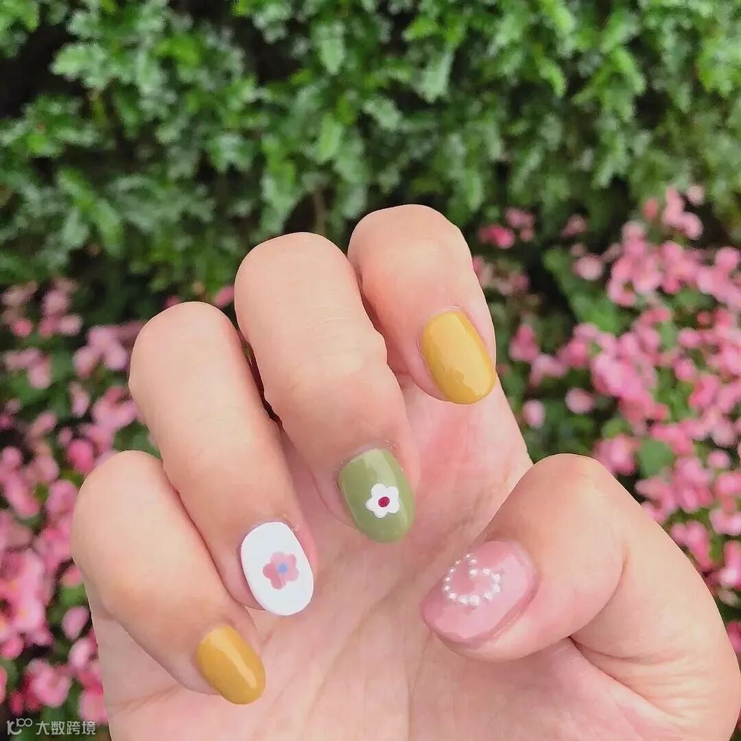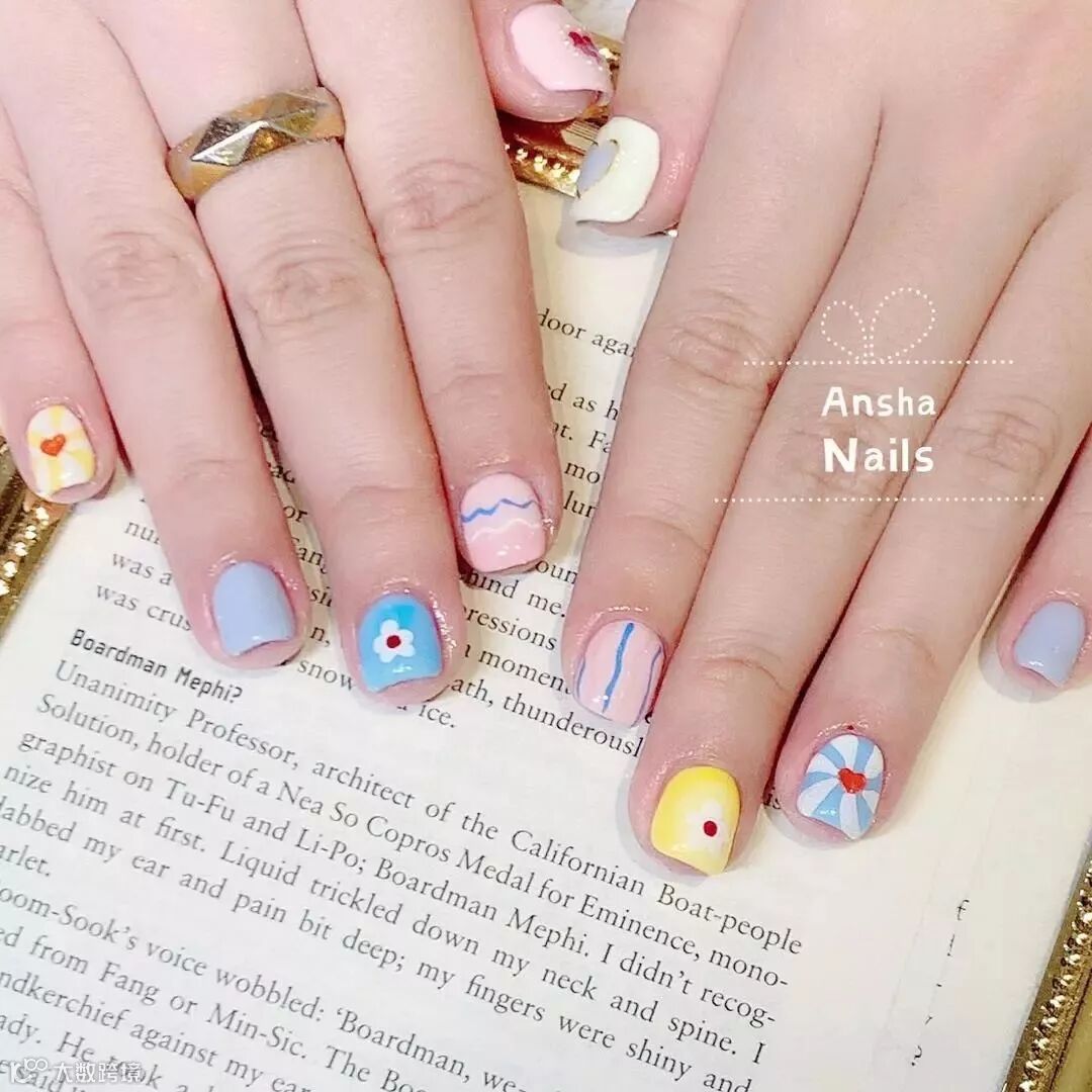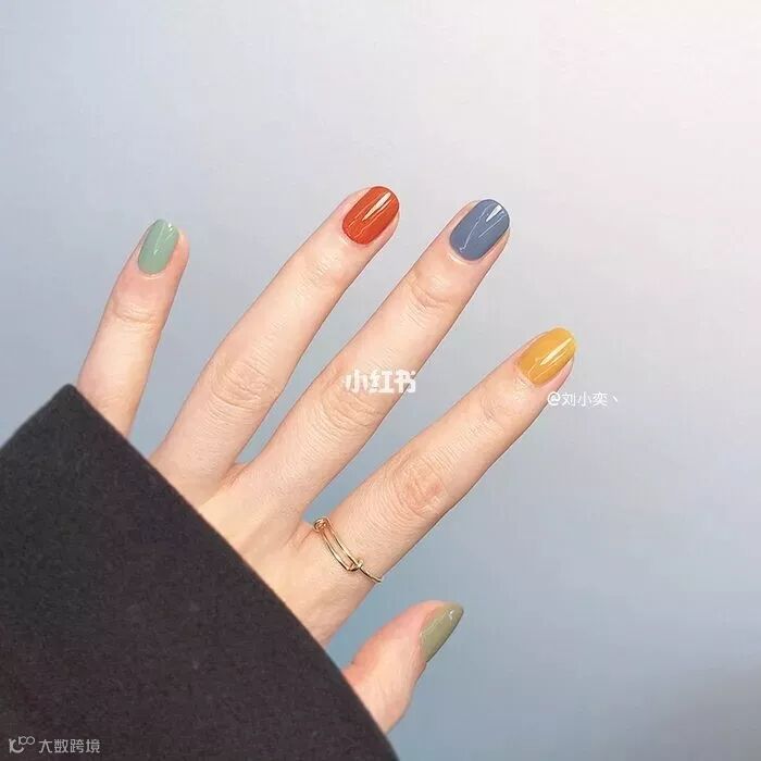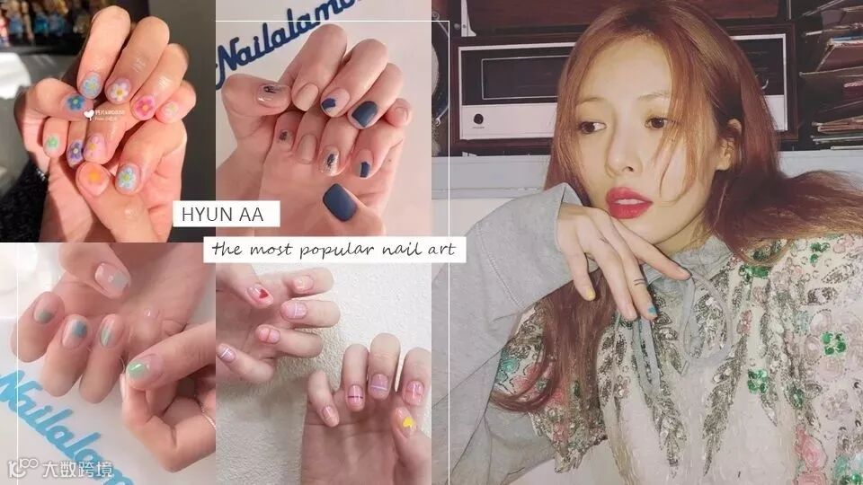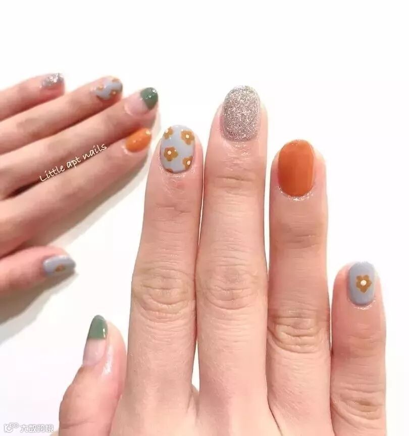 一说泫雅风,不要只想到小花朵,其实搜一下「泫雅美甲」你会发现,还有线条小元素为主的简约风格美甲,和颜色运用极其多的跳色风格。那么什么是跳色呢,百度上是这样解释的:容易给人带来视觉冲击的颜色,比如明黄、大红这些经常见于设计师与装修公司作品中的颜色。