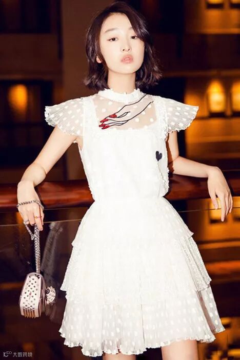 但如果是像周冬雨同时属于窄肩和小个子行列,可以稍微选一些蕾丝点缀的单品。