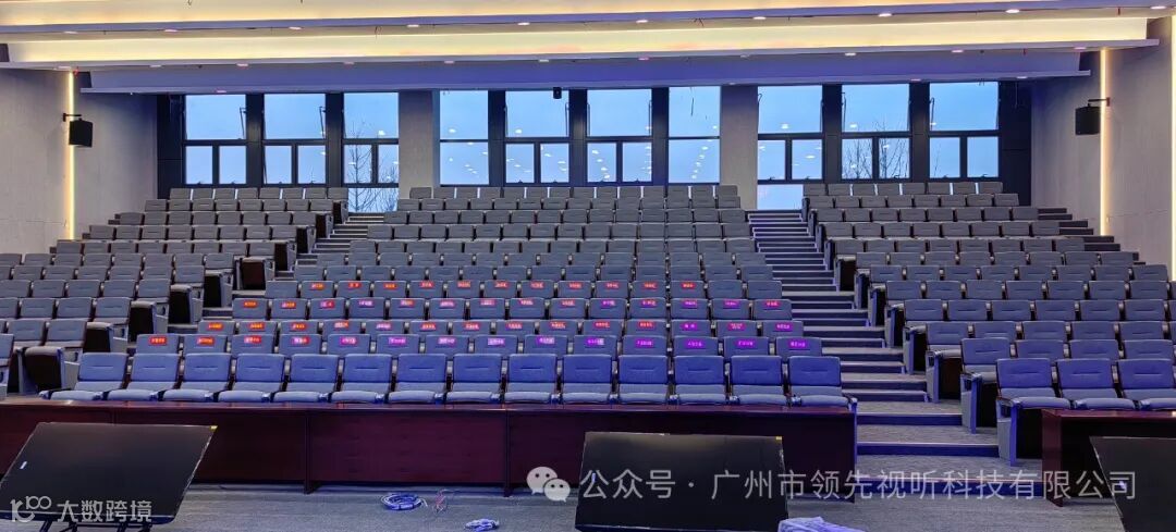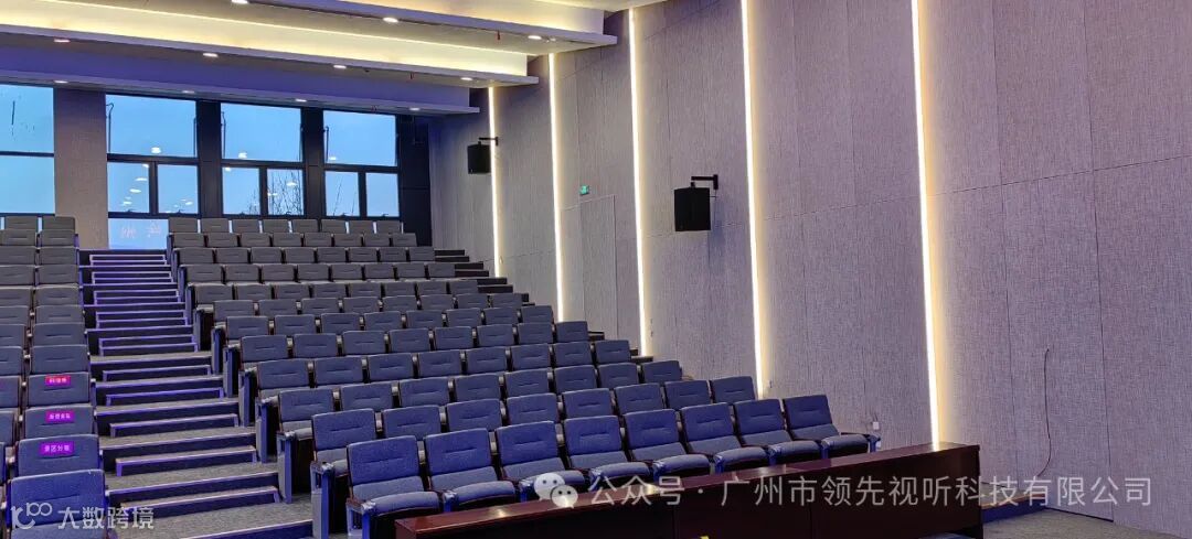 Martin Audio CDD系列的四只6.5寸同轴全频扬声器CDD6B位于舞台台口作为台唇扬声器使用,CDD系列具有独特的弧形外观设计与专利的同轴差分色散™技术相结合,同轴差分色散™技术提供更加均匀的听众区覆盖范围,针对听众区的后排输出更强的声音带来听众区从前到后更加均匀的覆盖,同时对距离音箱近的听众区提供水平方向的更宽范围的覆盖。增加的覆盖面积可以将大型安装中的扬声器数量减少从而大大降低了项目的总安装成本;搭配Martin Audio VIA系列功率放大器和DX系列处理器,整体设备满足了报告厅扩声系统的使用需求。