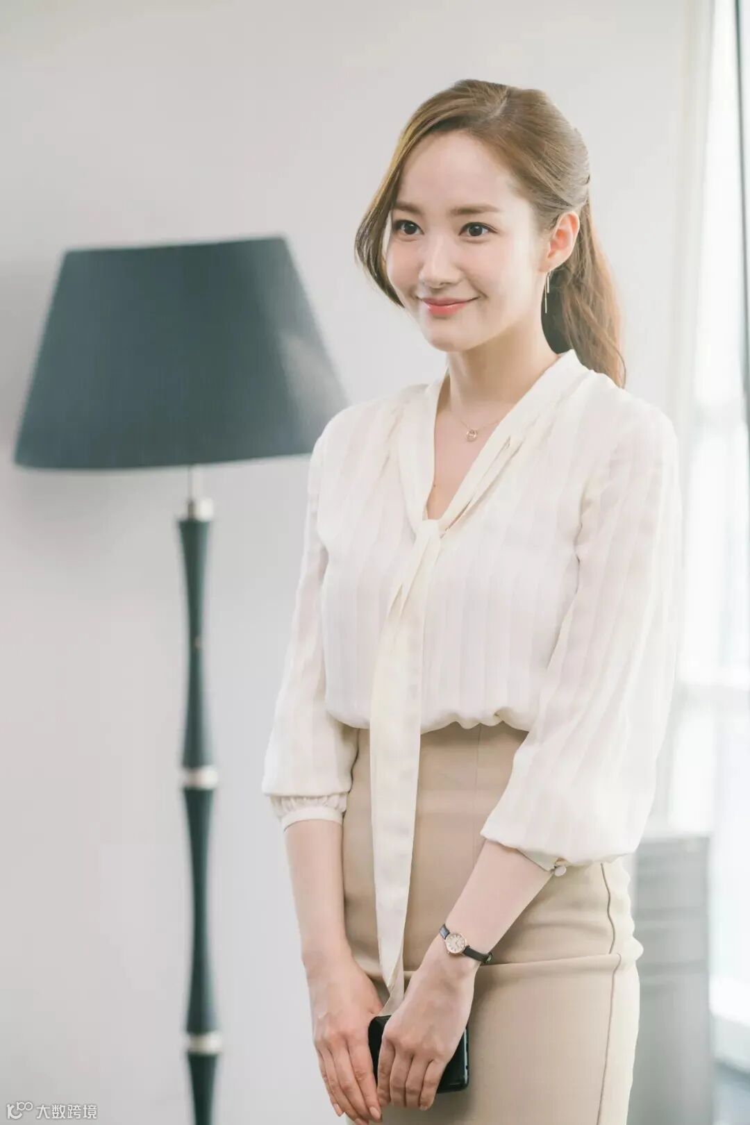 朴敏英在剧中的这身乳白色衬衫+米色包臀裙的搭配,简直就是职场模板级穿搭,好看又时髦。