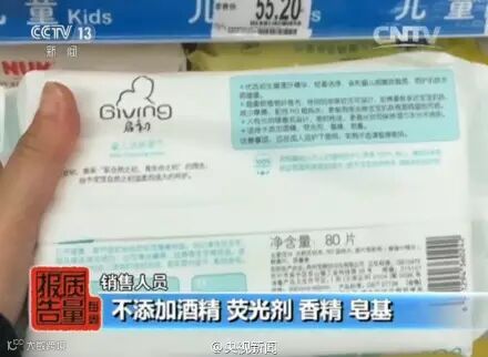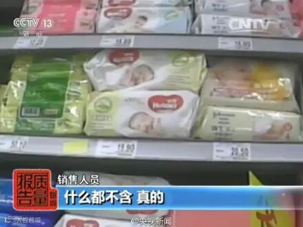 央视记者调查发现,在各大商场、超市,湿巾产品大多摆在日用卫生用品区的显眼位置,它们的价格通常比较亲民,从几块钱到几十块钱不等。在一些大型超市的母婴货架还有婴儿专用的湿巾在出售,通常主打的产品是洁肤湿巾、手口湿巾等。销售人员告诉记者,所谓的手口湿巾除了能够清洁皮肤之外,还能用于清洁婴儿口腔内壁和牙齿。手口湿巾的生产工艺要求更加严格,就算孩子吃到嘴里也是安全的。