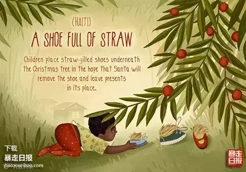 海地的小孩不用袜子,而是用塞满稻草的鞋子来迎接圣诞老人。他们将稻草鞋子放在圣诞树下,希望圣诞老人会移开鞋子,然后放上礼物。