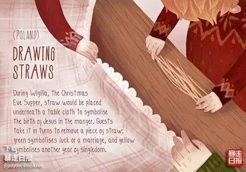 在圣诞节晚餐时, 波兰人会将一些稻草放在桌布下方,这样象征着耶稣降生一事。祈祷完之后,再轮流将一根根稻草抽出来,如果抽到绿色就代表明年会有好运或者好姻缘,而要是抽到黄色的稻草则代表明年将继续单身。
