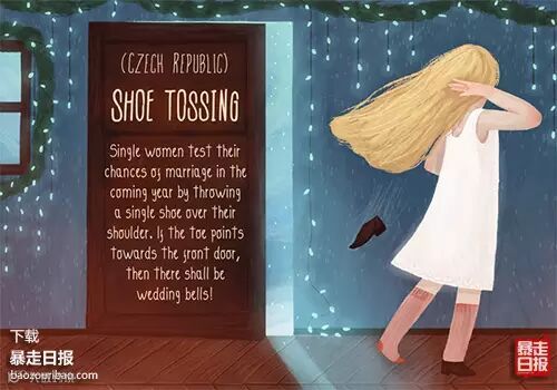 在捷克,有这么一个民俗,圣诞节时当地单身的姑娘会站在门口脱下一只鞋子,然后往后抛,如果越过肩膀的鞋子头朝着门外,那代表来年就有机会出嫁!