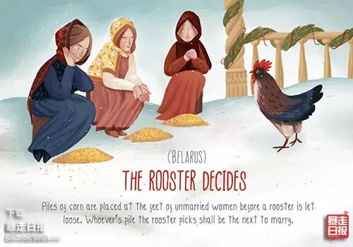 有点类似捧花,但是这项习俗更有趣,在圣诞节时当地的未婚女子会聚在一起并在自己脚边放些小玉米粒,然后看公鸡选择到谁的玉米堆里啄食,那谁就会是下一个新娘(感觉国外姑娘都很着急嫁出去似的......)。
