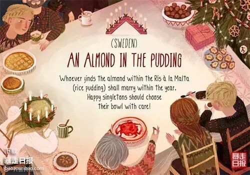 在瑞典,圣诞大餐上不可缺少的食物就是“米布丁”,根据传统,谁能吃到里面那唯一一颗杏仁,那么明年就会有喜结良缘的好运气,这一点跟我们春节饺子里包硬币差不多。