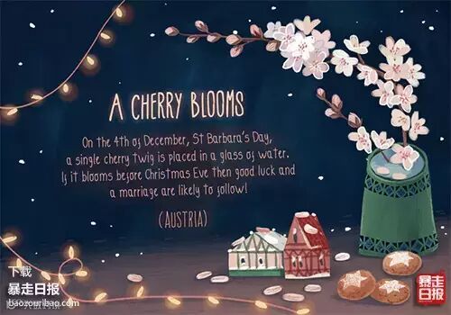 每年的12月4号,这一天人们会将樱花枝插进一只装了水的花瓶里,如果在平安夜之前顺利开花,就预示着明年会有好运,当然,对单身而言,这更意味着会走桃花运(虽然装的是樱花233)。