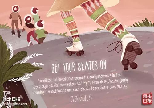 圣诞节前一周的早晨,委内瑞拉人会穿上溜冰鞋去参加清晨的弥撒,除此之外,为了保证民众的安全,当地还会将道路暂时封闭。