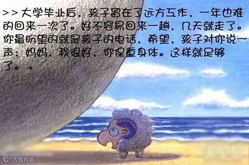 但是等到孩子长大了,逐渐有了自己的生活,有时候说话的机会都很少;然后孩子去远方求学,一年见面的机会都很少,思念的时候也只能打打电话;毕业后在远方工作,也许接电话的机会都很少了。