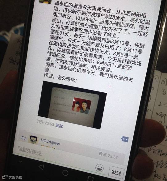 9月13日深夜11点53分,“我永远的老婆今天离我而去。从此后阴阳相隔,再也听不到你发脾气时喊胡金龙,高兴时温柔叫老公。以后不能一起再去转翡翠湖,爬大蜀山。打算好的台湾厦门(旅行)也去不了了。一起努力为宝宝买学区房也没有了意义。