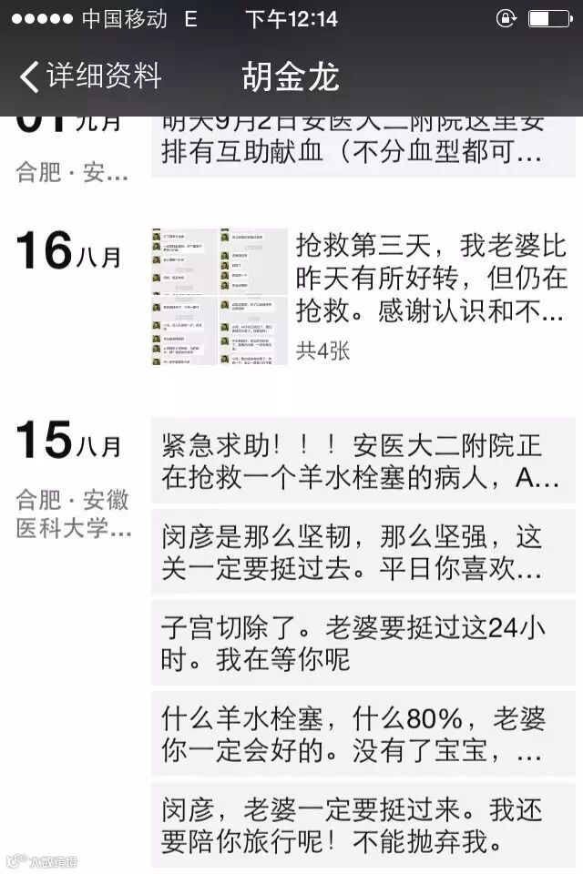 而且,从8月14日晚上,从妻子因羊水栓塞抢救开始,胡金龙就一直在祈祷,因妻子平时喜欢玩微信,他就在朋友圈里为妻子祈福。