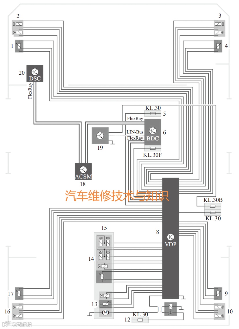 1-左前车辆高度传感器;2-左前EDC阀(电子减振器控制系统);3-右前EDC阀(电子减振器控制系统);4-右前车辆高度传感器;5-右前配电盒;6-车身域控制器BDC;7-右后配电盒;8-垂直动态管理平台VDP;9-右后车辆高度传感器;10-右后EDC阀(电子减振器控制系统);11-空气供给装置继电器;12-蓄电池正极配电盒;13-压缩机;14-电磁阀体;15-空气供给装置;16-左后EDC阀(电子减振器控制系统);17-左后车辆高度传感器;18-碰撞和安全模块ACSM;19-高度调节开关;20-动态稳定控制系统DSC