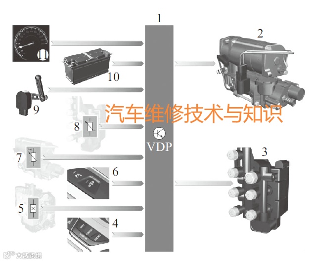 1-垂直动态管理平台VDP;2-压缩机;3-电磁阀体;4-驾驶体验开关;5-车门触点开关;6-高度调节开关;7-温度传感器(在压缩机内);8-压力传感器(在电磁阀体内);9-车辆高度传感器;10-车载网络电压;11-车速