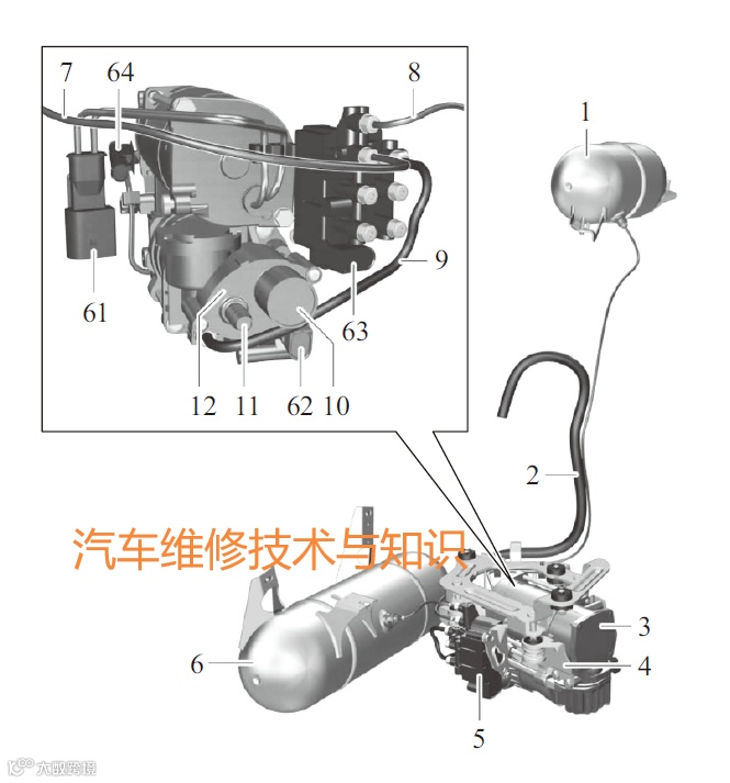 1-2L蓄压器;2-进气软管;3-电动压缩机;4-带减振器的支架;5-电磁阀体;6-4L蓄压器;7-2L蓄压器压缩空气管路;8-4L蓄压器压缩空气管路;9-用于为电磁阀体供给空气的压缩空气管路;10-大气通风装置;11-进气软管接口;12-空气滤清器壳体端盖;61-电动空气压缩机插接触点;62-电动排放电磁阀插接触点;63-电磁阀体插接触点;64-温度传感器插接触点