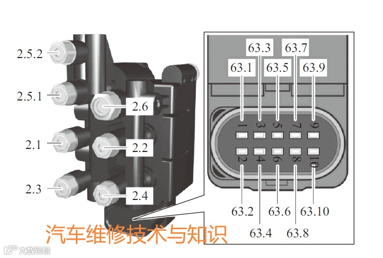 2.1-输出端1能量排出(左前空气弹簧减振支柱);2.2-输出端2能量排出(右前空气弹簧减振支柱);2.3-输出端3能量排出(左后空气弹簧减振支柱);2.4-输出端4能量排出(右后空气弹簧减振支柱);2.5.1-2L蓄压器能量排出;2.5.2-4L蓄压器能量排出;63.1-控制用于左前空气弹簧减振支柱的电磁阀;63.2-控制蓄压器电磁阀;63.3-控制用于左后空气弹簧减振支柱的电磁阀;63.4-控制用于右前空气弹簧减振支柱的电磁阀;63.5-接地;63.6-接地;63.7-传感器接地(压力传感器);63.8-控制用于右后空气弹簧减振支柱的电磁阀;63.9-传感器供电(压力传感器);63.10-传感器信号输出端(压力传感器)