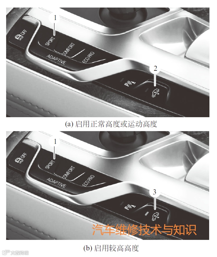 如下图所示,可通过高度调节开关和驾驶体验开关手动调节车辆高度。