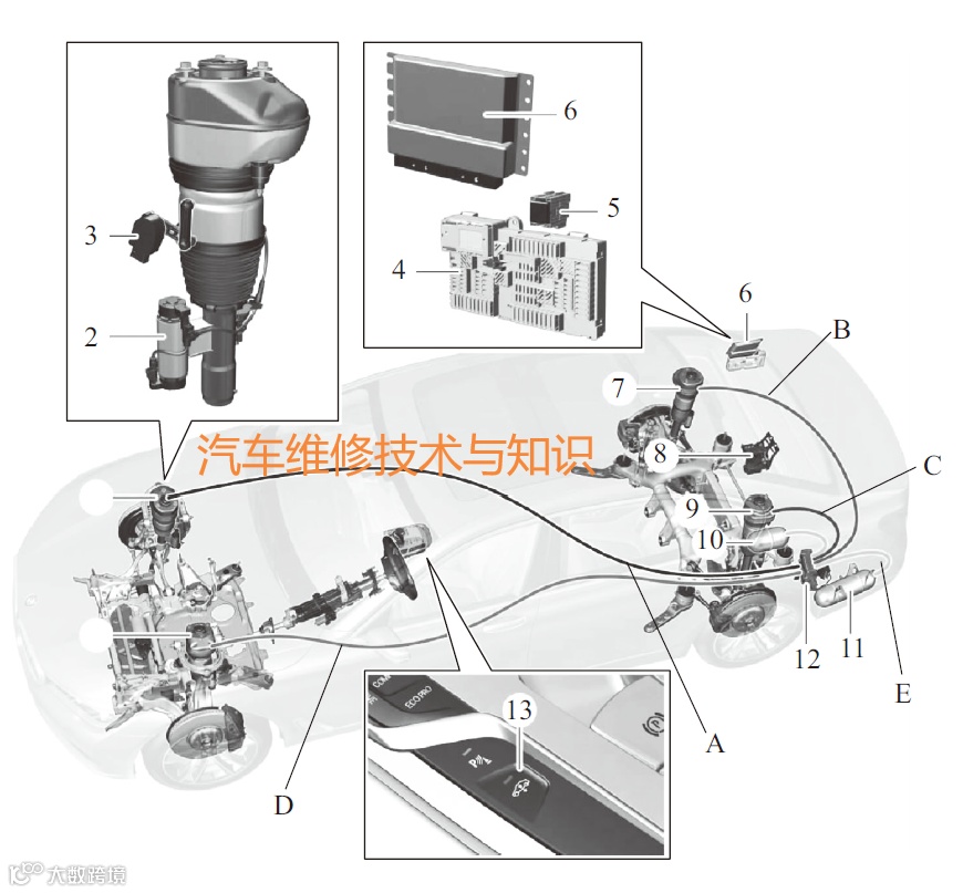 A-右前压缩空气管路(颜色代码:黑色);B-右后压缩空气管路(颜色代码:蓝色);C-左后压缩空气管路(颜色代码:红色);D-左前压缩空气管路(颜色代码:绿色);E-蓄压器压缩空气管路(颜色代码:黄色);1-右前空气弹簧减振支柱;2-右前EDC阀(电子减振器控制系统);3-右前车辆高度传感器;4-右后配电盒;5-空气供给装置继电器;6-垂直动态管理平台VDP(中央控制单元);7-右后空气弹簧减振支柱;8-蓄电池正极配电盒;9-左后空气弹簧减振支柱;10-21蓄压器;11-41蓄压器;12-空气供给装置;13-高度调节开关;14-左前空气弹簧减振支柱