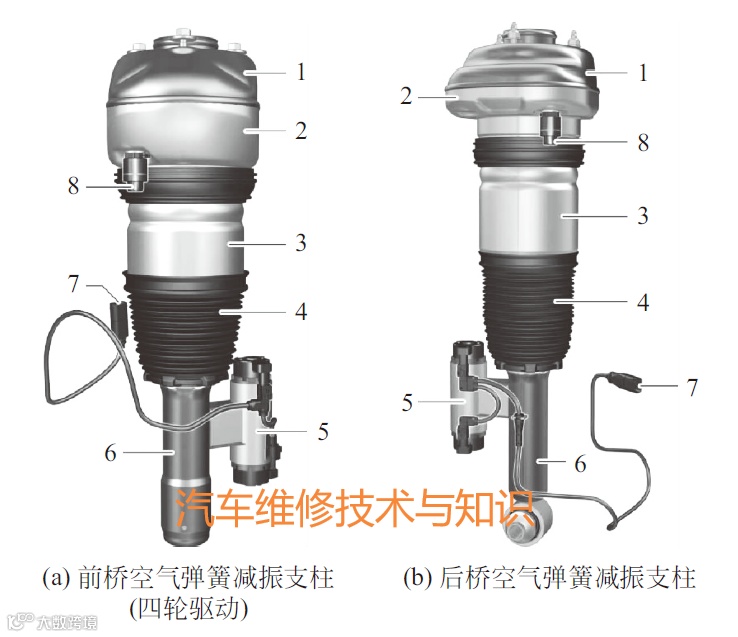 1-上部件顶部;2-下部件顶部;3-膜片折叠气囊;4-防尘套;5-电子减振器控制系统EDC调节阀;6-减振器筒;7-减振器调节装置电气接口;8-带集成式剩余压力保持阀的气动接口