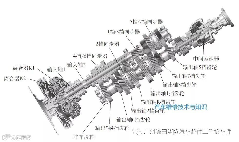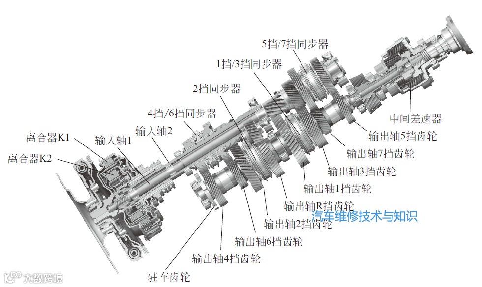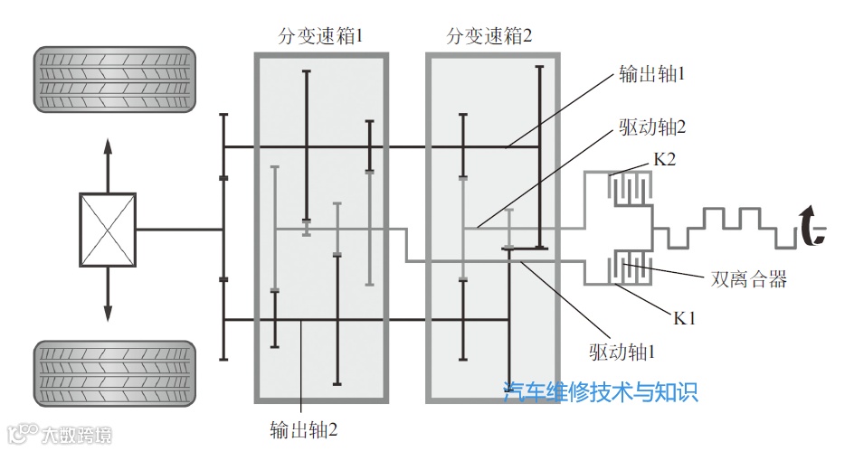 双离合器自动变速器实际上由两套彼此独立的分变速器组成。两个离合器各控制一个分变速器的挡位变换。双离合器变速器基本组成如下图所示。