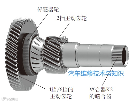 输入轴2是空心轴。它与离合器K2通过啮合齿相连。通过输入轴2可以实现2挡、4挡、6挡和倒挡之间的切换,如下图所示。为了获取输入轴的转速,在此轴上装有用于检测输入轴2转速的传感器轮。