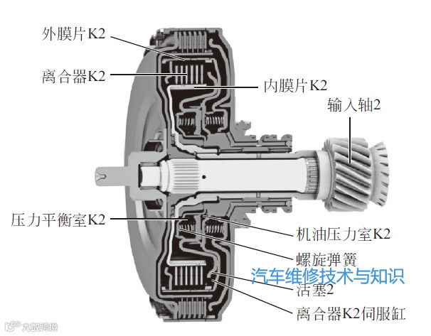 当油液从离合器K2进油口进入离合器K2伺服缸内时,液压油便推动离合器K2的活塞压紧离合器片,将离合器鼓与毂连成一体,即将输入轴与主动轴2连成一体,使输入轴2上的2挡、4挡、6挡、R挡齿轮随输入轴2一同旋转。于是输入