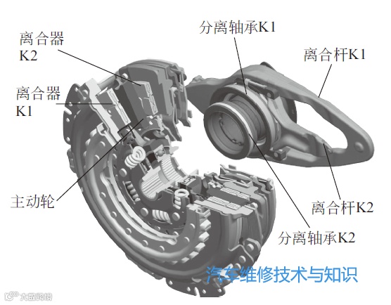 干式双离合器变速器和湿式双离合器变速器主要区别在于双离合器的结构不同。换挡执行机构和齿轮变速器结构原理相同。