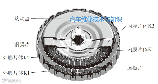 干式双离合器由两个尺寸相近的膜片式离合器片同轴相叠安装组成。而湿式双离合器采用两个多片离合器组件,因两个多片离合器组件始终浸在油液中,故称湿式双离合器。干式和湿式双离合器结构分别如下图所示。
