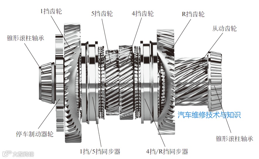 在输出轴1上安装有1挡、4挡、5挡和倒挡齿轮,1挡/5挡同步器,4挡/倒挡同步器,驻车齿轮等,如下图所示。