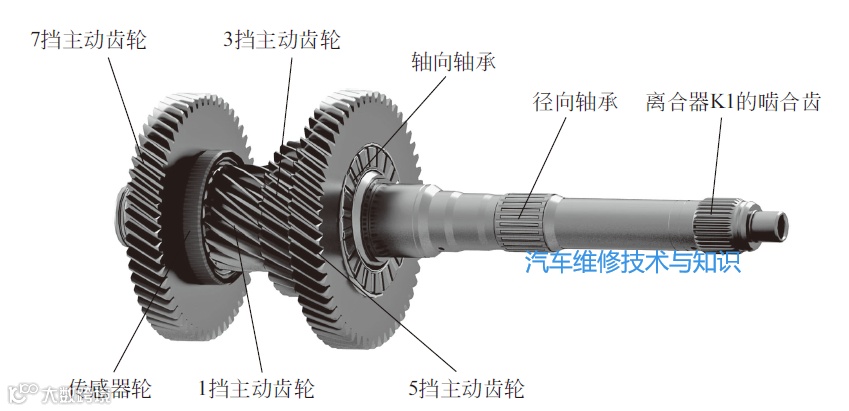 输入轴1和离合器K1通过啮合齿相连,将发动机输入转矩传递给1挡、3挡、5挡、7挡主动齿轮,如下图所示。为了获取输入轴1的转速,在此轴上装有用于检测输入轴转速的传感器轮。