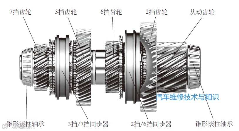 在输出轴2上安装有2挡、3挡、6挡和7挡齿轮,3挡/7挡同步器,2挡/6挡同步器,倒挡惰轮等,其中,2挡、3挡同步器为三倍同步器,6挡、7挡同步器为单倍同步器,如下图所示。
